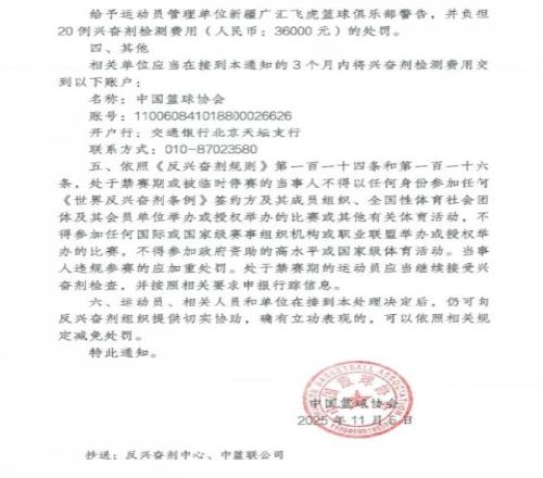 三、对管理单位的处罚给予运动员管理单位新疆广汇飞虎篮球俱乐部警告,并负担20例兴奋剂检测费用(人民币:36000元)的处罚。