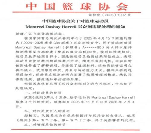 北京时间11月6日,中国篮协官方发布前新疆男篮哈雷尔的处罚公告,哈雷尔因为A样本检测呈大麻酚类阳性,且其放弃检测B样本,违规成立禁赛三个月,新疆男篮承担20例兴奋剂检测费用36000元。